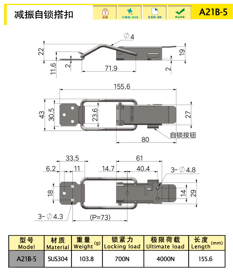 搭扣獨特的自鎖機構(gòu)設(shè)計,防止搭扣在使用過程中彈開,使用方便安全