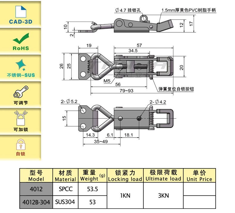 搭扣獨(dú)特的自鎖機(jī)構(gòu)設(shè)計(jì),防止搭扣在使用過程中彈開,使用方便安全
