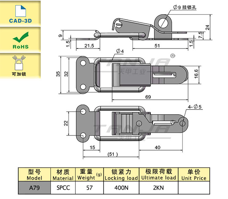 長度(mm) 長度(mm) 材質(zhì) 材質(zhì) 重量(g) 鎖緊力(N) 鎖緊力(N) 極限荷載(N) 極限荷載(N) 功能 功能