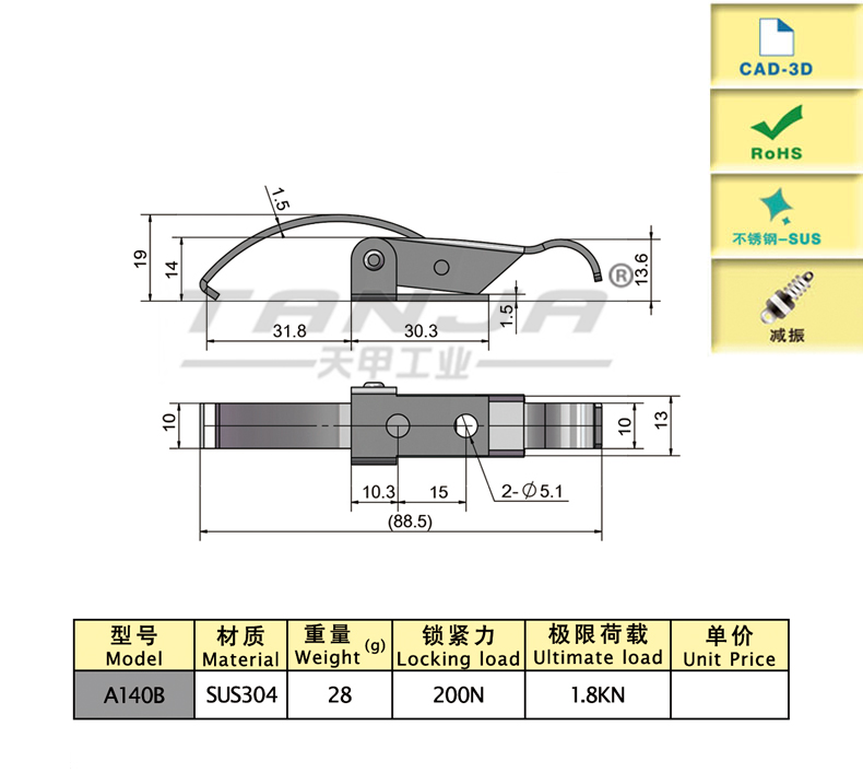 長(zhǎng)度(mm) 長(zhǎng)度(mm) 材質(zhì) 材質(zhì) 重量(g) 鎖緊力(N) 鎖緊力(N) 極限荷載(N) 極限荷載(N) 功能 功能